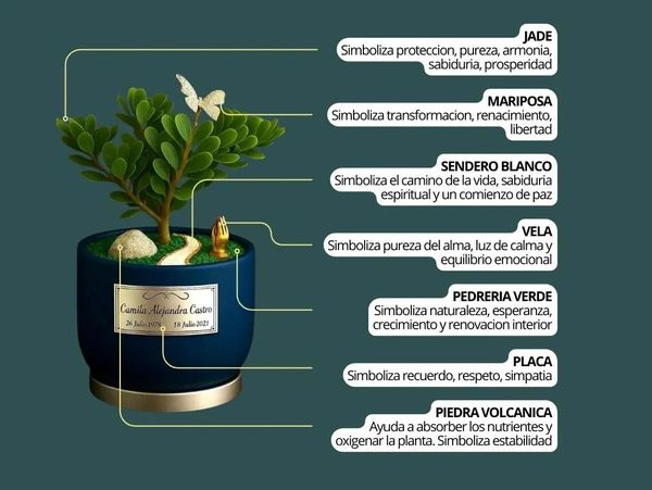 Cada homenaje ecológico es adornado con una bella vela, una piedra volcánica, un poema, una mariposa, y una placa en oro, plata o bronze (la placa va con el nombre de la persona, fecha de nacimiento | fallecimiento y una frase de amor que la familia desee incluir). Cada elemento provee un significado único y especial para formar el homenaje
